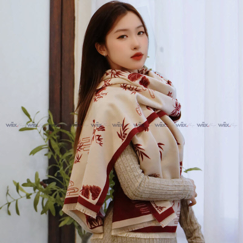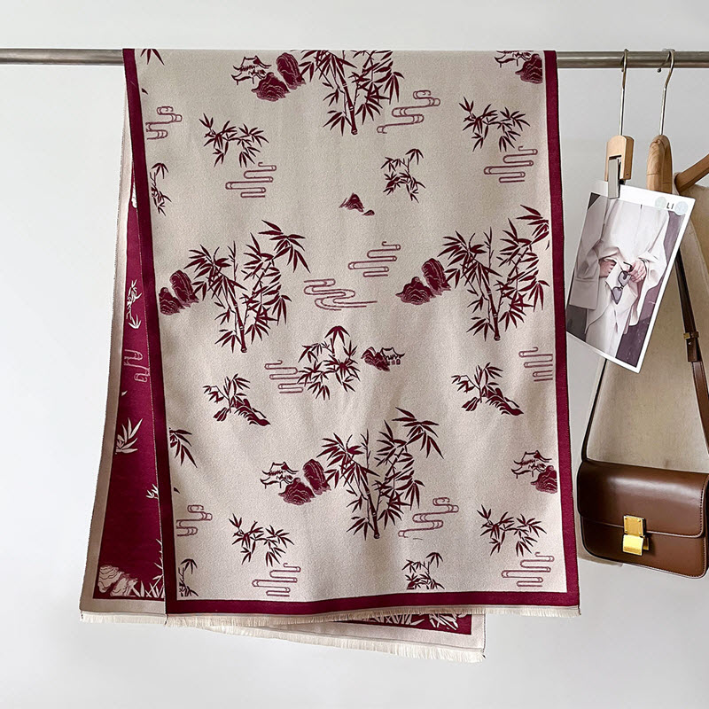 The design of the ladies’ cashmere scarf KQ-WD34 draws from traditional ink landscapes, blending elegance and cultural depth. Graceful bamboo branches and light cloud patterns symbolize strength, growth, and tranquility. The pattern is double-sided, beige on one side and deep burgundy on the other, offering two complementary looks in one accessory.