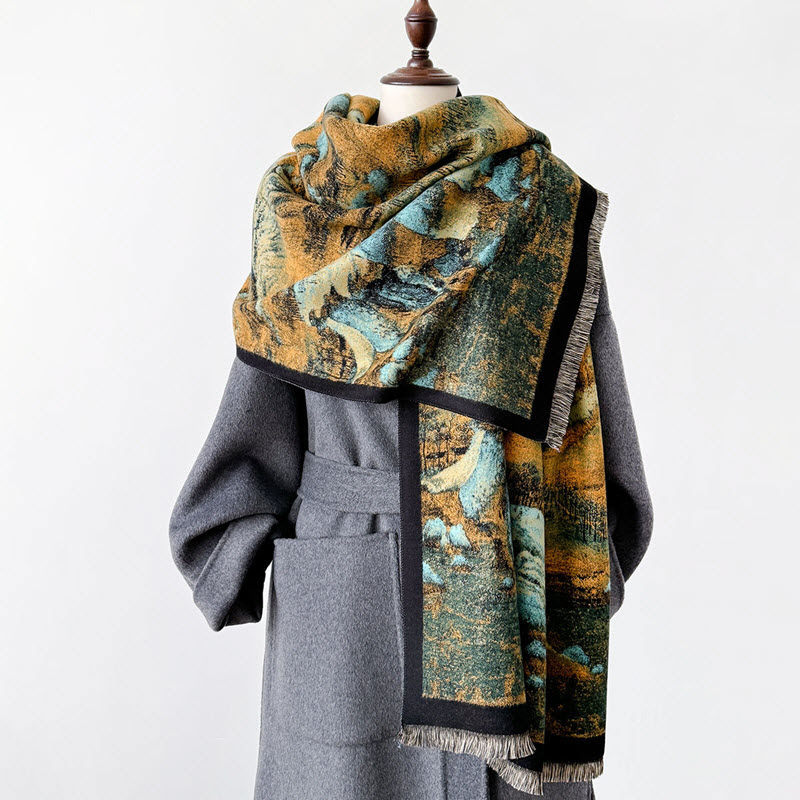The Cashmere Scarf KQ-WD38 is more than a winter accessory; it’s a wearable work of art. Inspired by the legendary Chinese landscape masterpiece A Thousand Miles of Rivers and Mountains, this design captures the poetic beauty of nature through every thread.