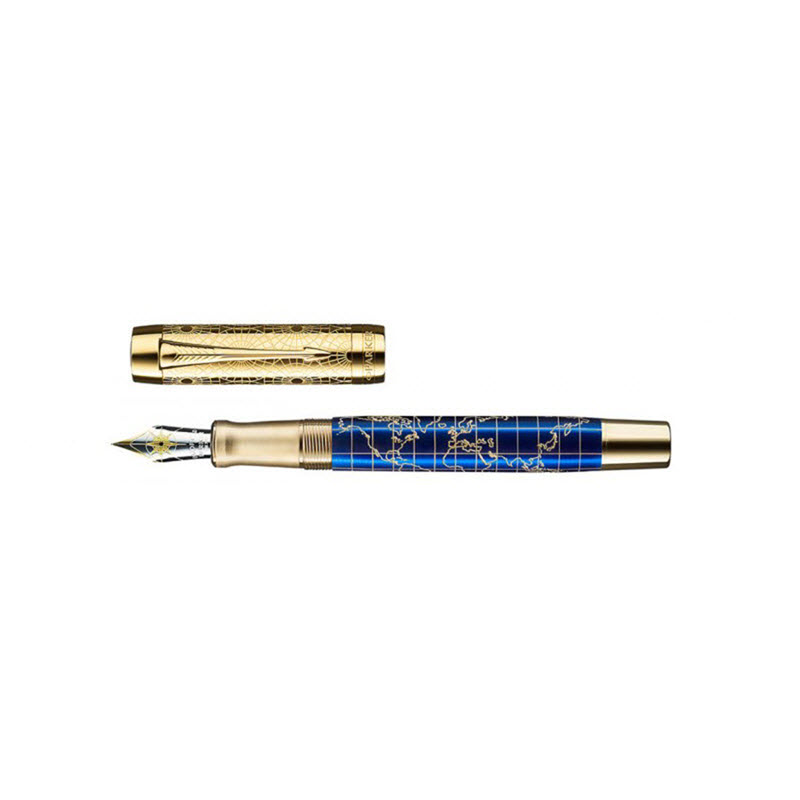 Every Parker Duofold 130th Anniversary pen is a product of meticulous hand assembly, crafted from 22 precision-made components. The barrel, finished in deep ocean-blue lacquer, features a laser-engraved world map that retraces the legendary journeys of George S. Parker. The cap, adorned in 23K gold plating, carries geometric engravings inspired by navigational instruments and features a lapis-blue stone etched with a meridian pattern at its crown.