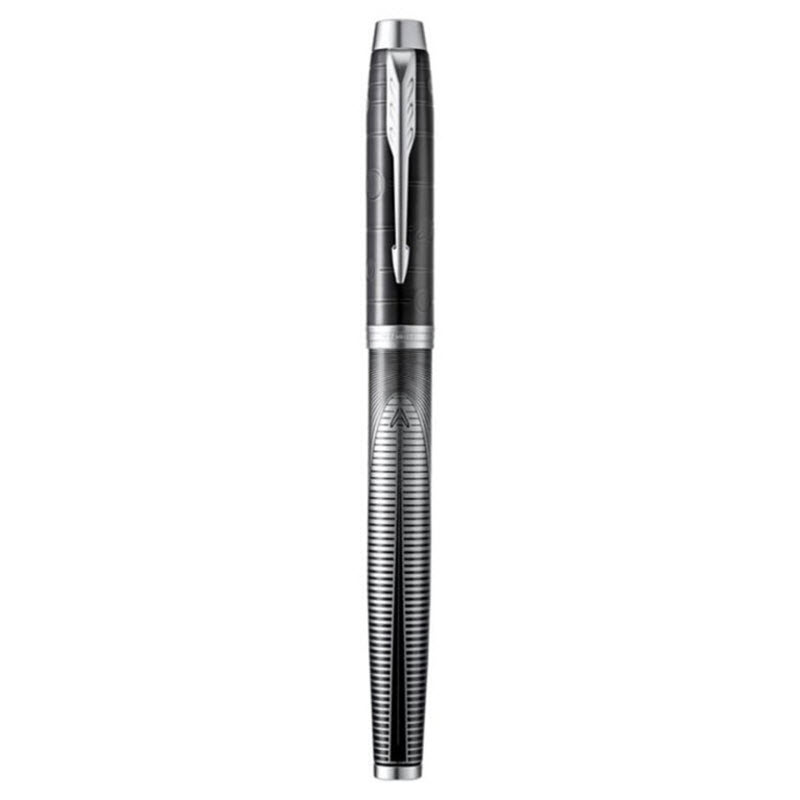 The Parker IM SE Metallic M GB4 2074145 rollerball pen immediately commands attention with its expressive and sophisticated finish. Both the cap and the body are decorated with a lively, etched pattern that evokes the concept of a unique and ever-changing journey. This dynamic design of flowing stainless steel lines across a rich, black varnished body serves as a constant reminder that the road to success is different for every individual. It suggests movement, momentum, and the individual’s power to chart their own path.