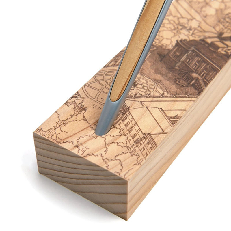 The engraved cedar base adds another layer of artistry. The texture, grain, and warm tone of the wood harmonize with the modern metallic form of the pencil, creating a visual connection between past and present. Every detail is handcrafted in Italy, ensuring that each set carries the authenticity and character associated with Italian design excellence.