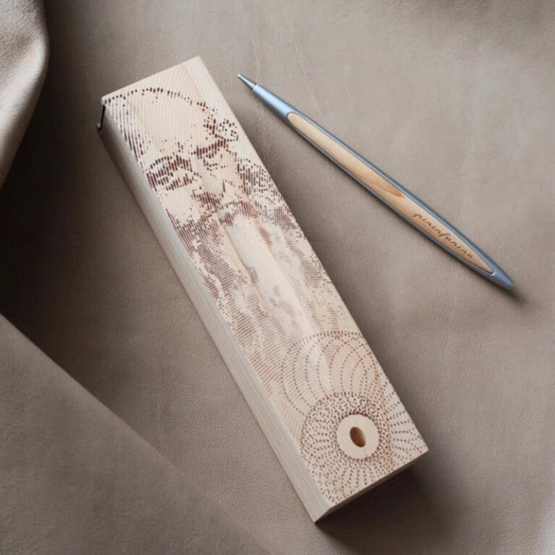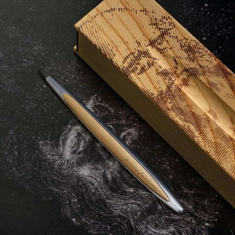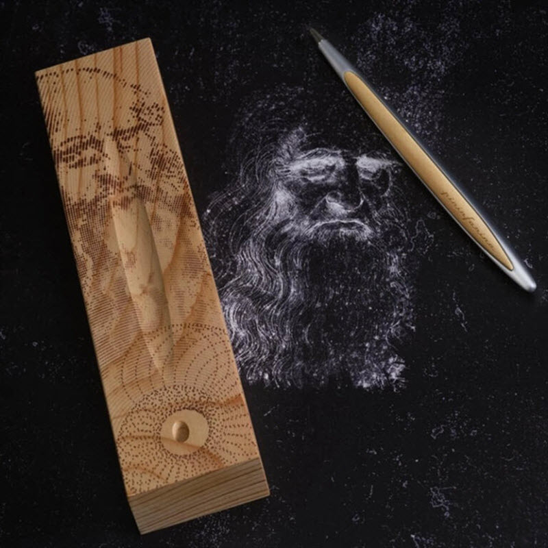 Every detail of the Cambiano Leonardo Edition is engineered with intention. The pen’s body is sculpted from solid aluminum and natural cedar wood, creating a combination of modern precision and warm, organic texture. The cedar box itself is laser-etched with an artistic reproduction of Da Vinci’s portrait, giving the entire set the look and feel of a museum-grade collectible.
